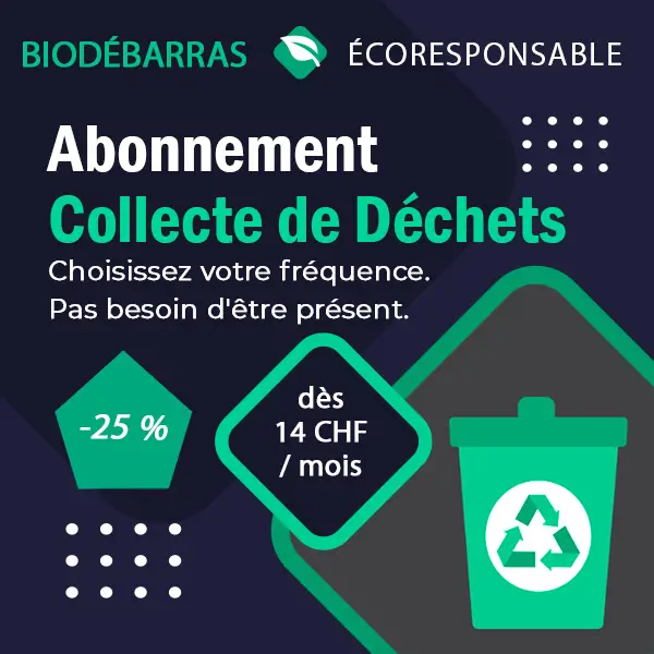 Collecte de déchets à domicile, abonnement recyclage, ramassage écologique, tri sélectif, gestion des déchets, service de collecte en Suisse Romande, Genève, Vaud, Fribourg, Neuchâtel, Lausanne, solution de recyclage, ramassage régulier, déchèterie mobile, élimination des déchets, tri écologique, service de proximité, collecte responsable, réduction des déchets, recyclage durable, service pratique et économique.